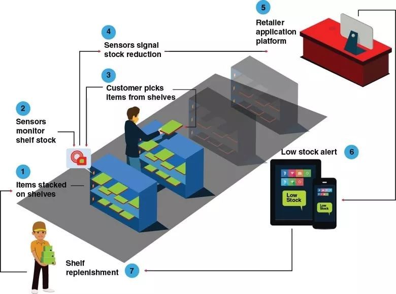 例如,當前采用 RFID 技術的“智能貨架”,可以告訴企業主物品提貨與銷售的比例并顯示動態價格。使用 5G 技術,配備傳感器的貨架可以確定產品的低庫存,通知配送中心以補充庫存,并動態監控貨物的運送進度。