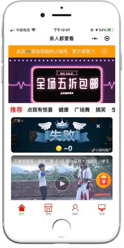 特色功能: 1. 支持自定義界面顏色 2. 支持接入流量主廣告、自定義廣告 3. 支持新增用戶推廣裂變功能 4. 支持刷一刷模式,配合豎版視頻采集 5. 添加前端搜索框 6. 支持自動同步