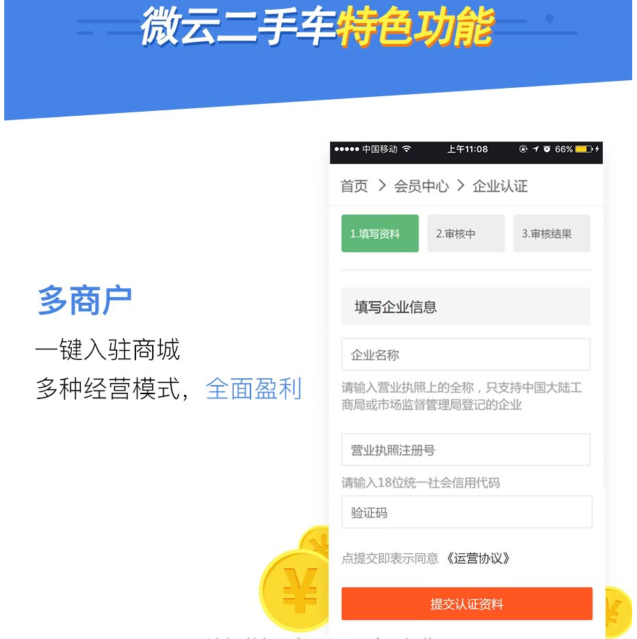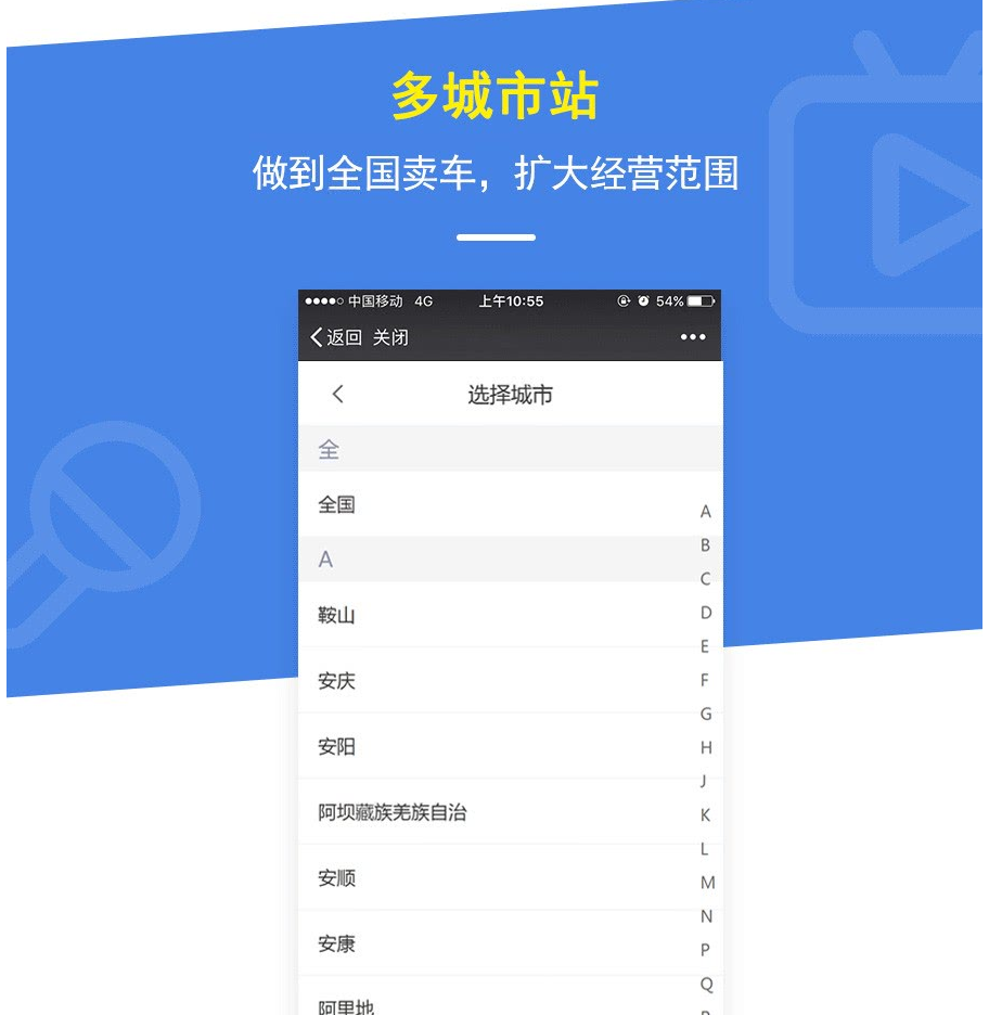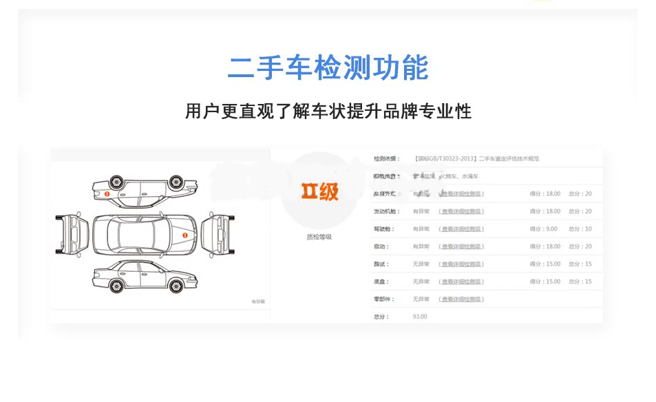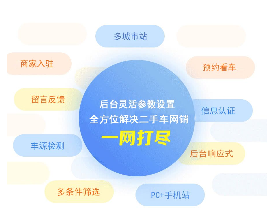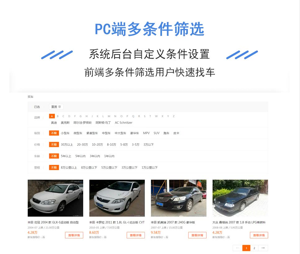 特色功能: 1. 支持系統后臺自定義條件設置 2. 支持二手車檢測功能 3. 支持商家入駐、后臺響應式 4. 支持車源檢測、多條件篩選 5. 支持預約看車、信息認證 6. 支持留言反饋、多城市站